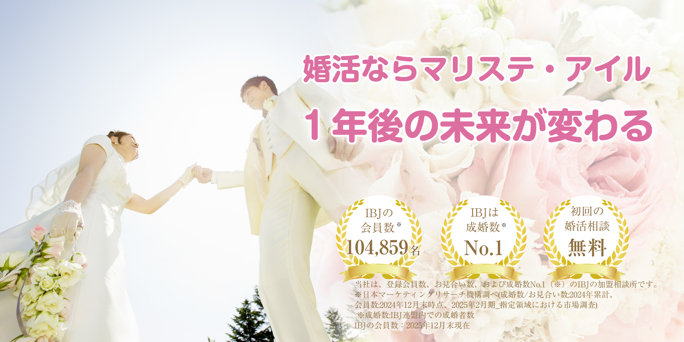 marriage station ILLは、104,859名(2025年12月時点)、日本最大級の結婚相談所ネットワーク「IBJ」の正規加盟店です。
